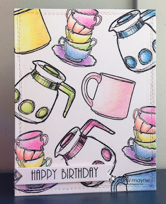 and  the second, another pencil coloured versions, featuring the Crazy Double Running Stitch Rectangle Nesting Dies stamped with a variety of images from Coffee Happy and a sentiment from Dee's Arsty Impressions Balloons and Banners.